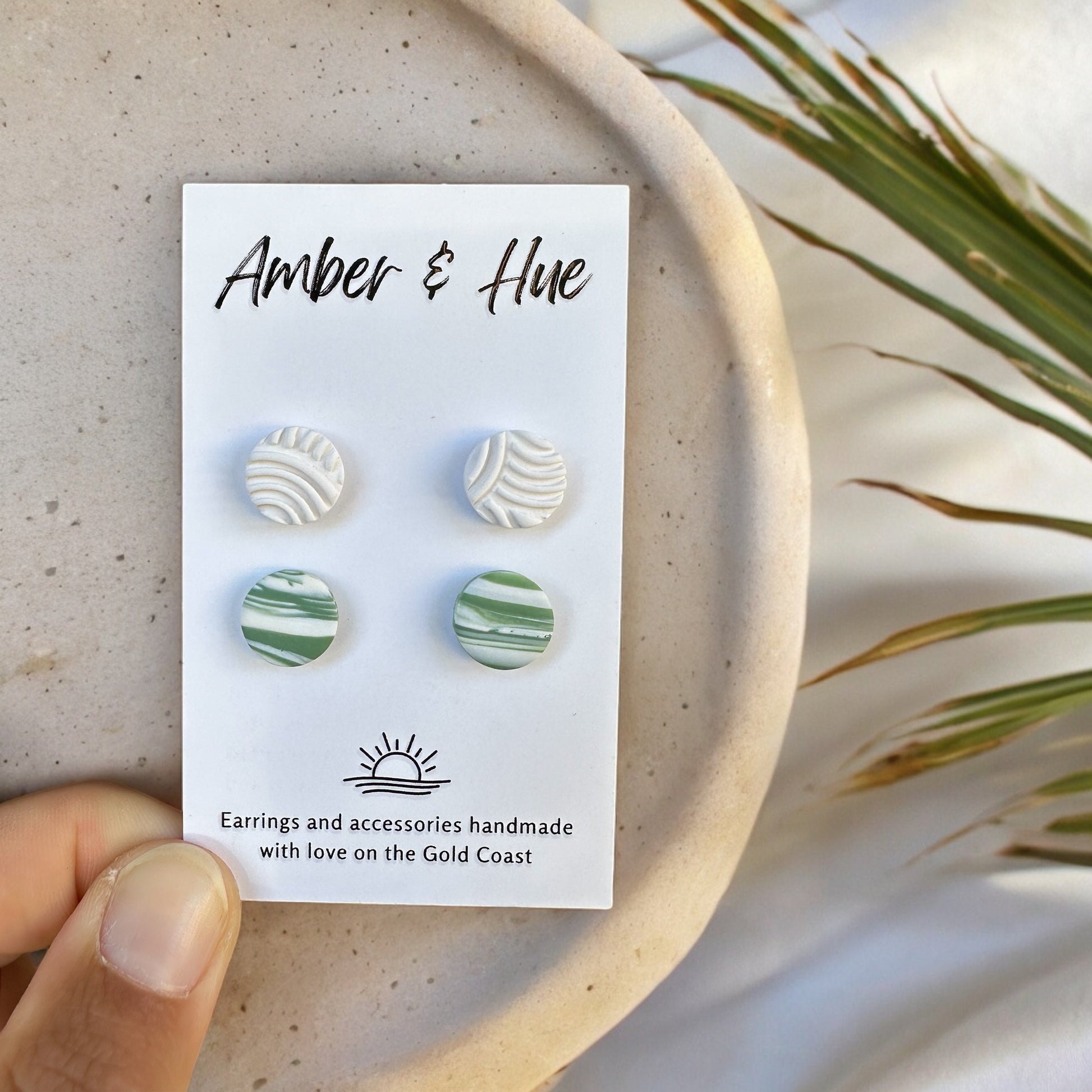 - Marbled Green Studs: The mesmerizing marbled green design injects a pop of color and a touch of nature-inspired charm.