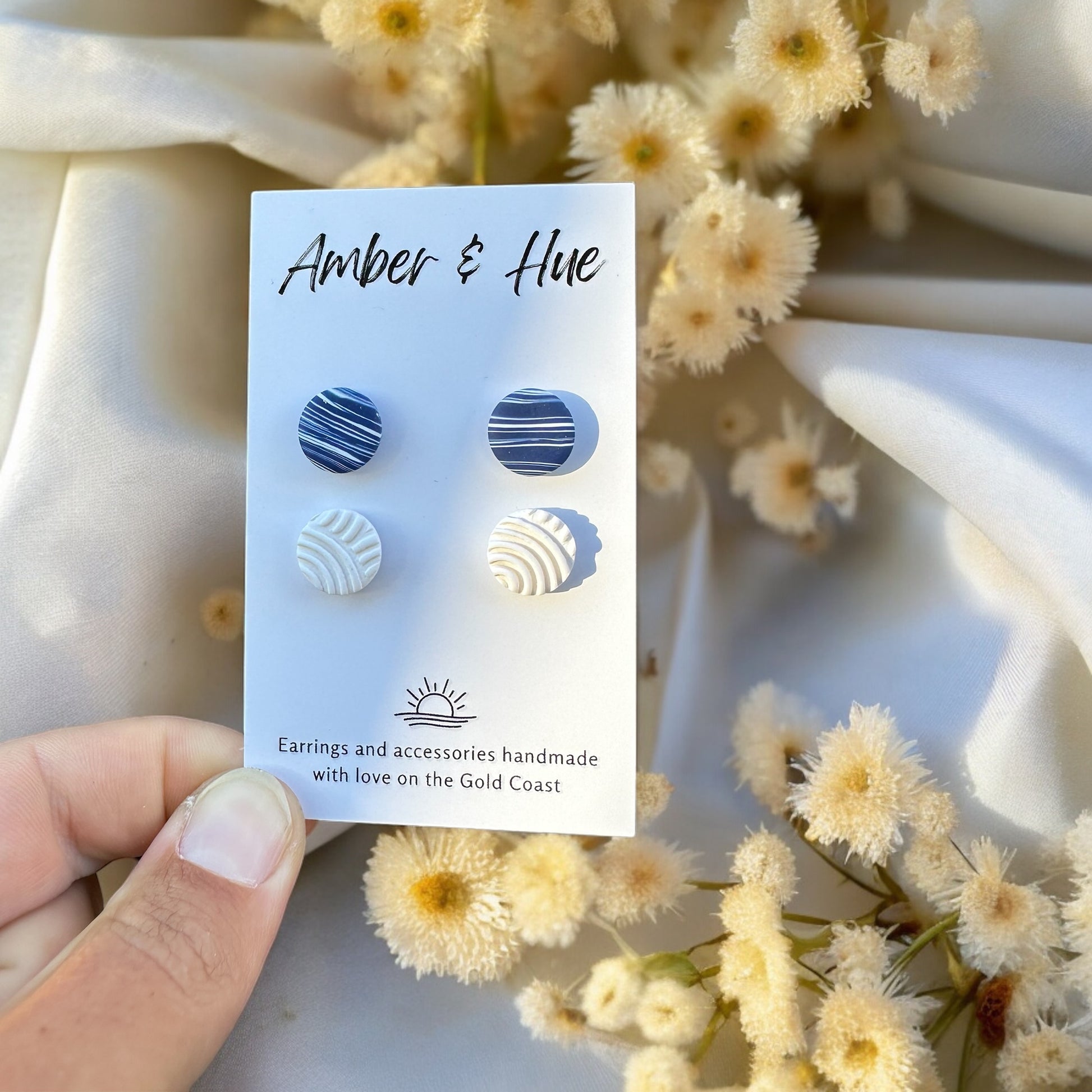 Elevate your everyday style with this curated Stud Pack, featuring a stunning combination of textured white and marbled navy blue polymer clay earrings, all meticulously handcrafted! This versatile duo offers endless possibilities to express your unique personality, whether you crave a touch of timeless elegance or a hint of modern flair.