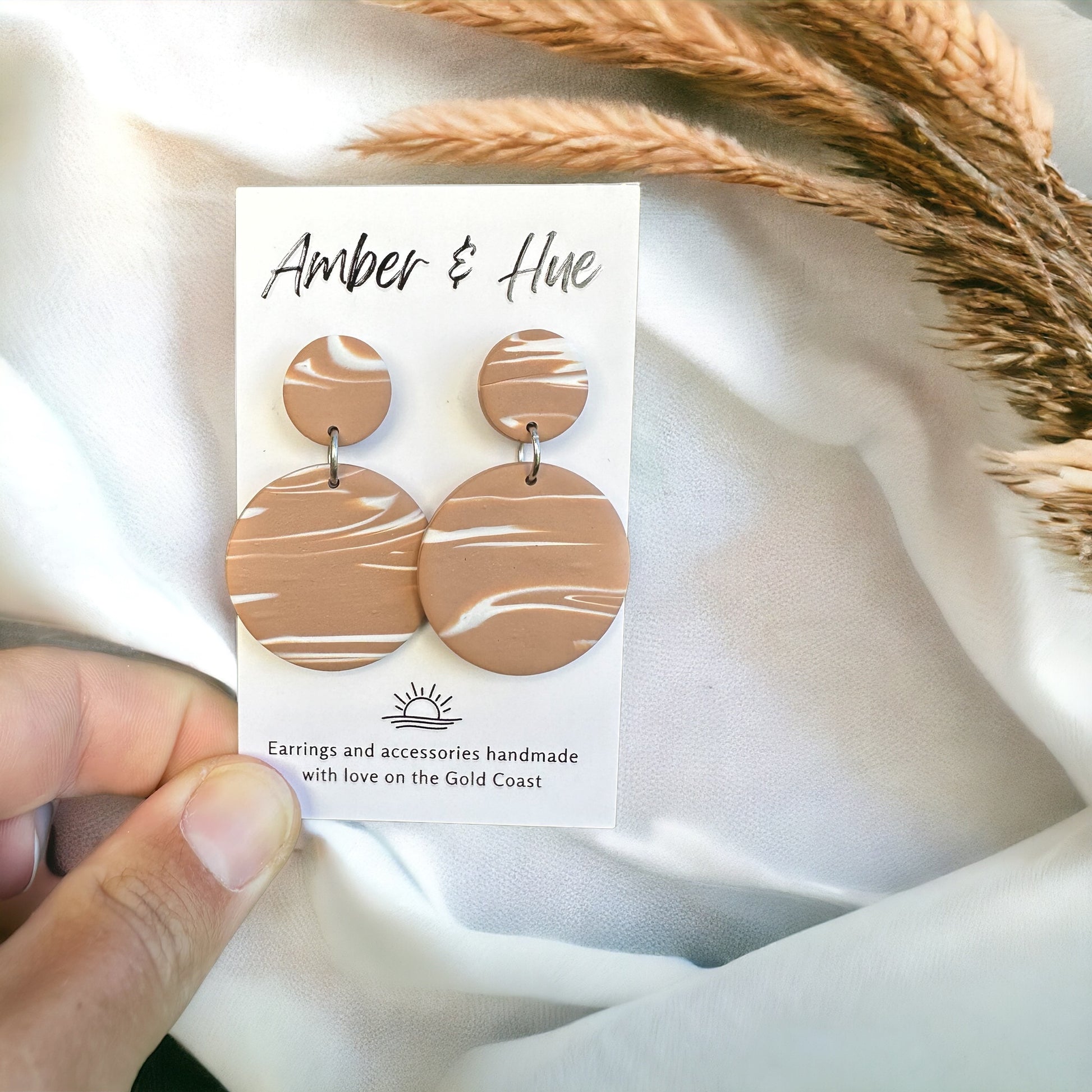 Embrace the beauty of nature's neutrals with these captivating tan marbled round dangle earrings, meticulously handcrafted from polymer clay. The mesmerising swirls of color add a touch of organic elegance to your everyday look.