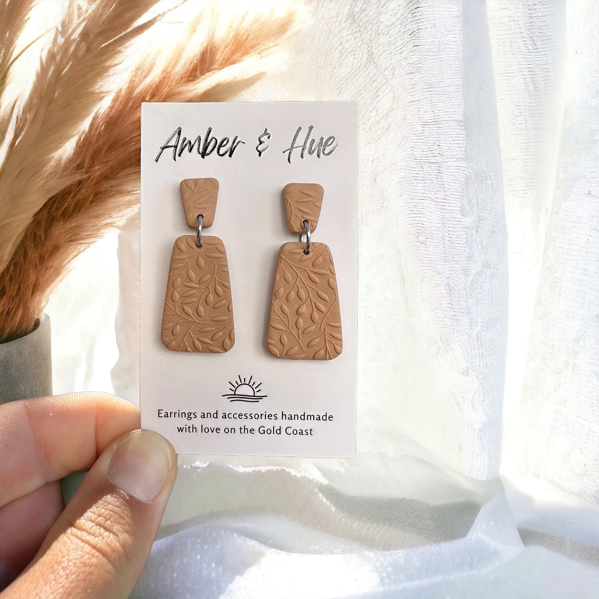 Embrace the beauty of the changing season with these captivating tan leaf print dangle earrings, meticulously handcrafted from polymer clay. The warm tan base and delicate leaf design evoke the essence of autumn, adding a touch of earthy elegance to your everyday look.