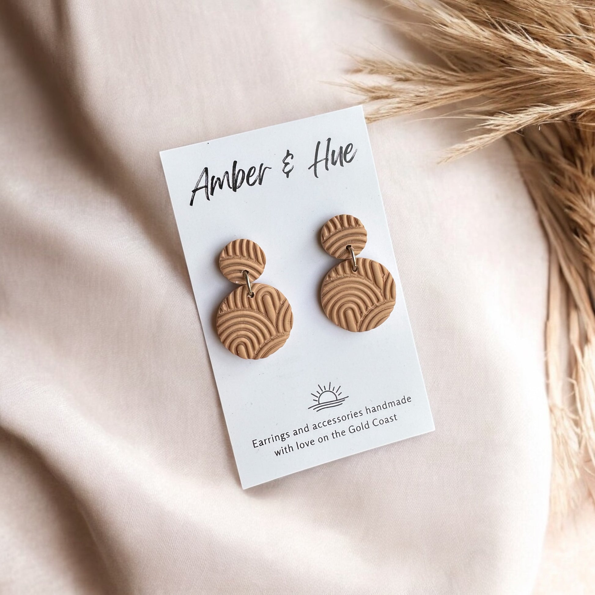 Handcrafted with love from lightweight polymer clay, these earrings offer a unique blend of earthy elegance and subtle texture. The warm tan hue complements any outfit, making them a versatile addition to your jewelry collection.