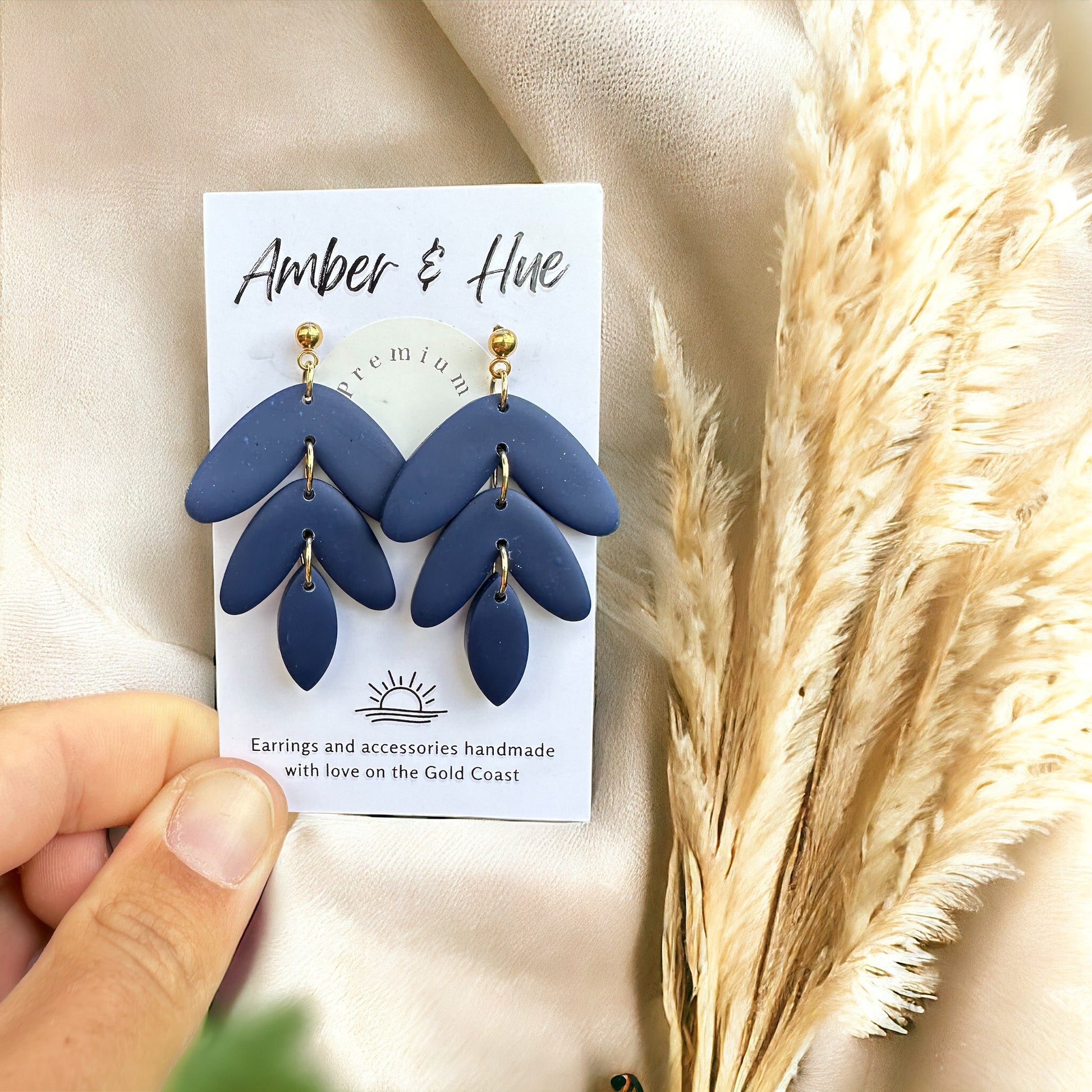 Embrace the timeless beauty of floral motifs with these captivating three-tier navy blue statement dangle earrings, meticulously handcrafted from polymer clay.
