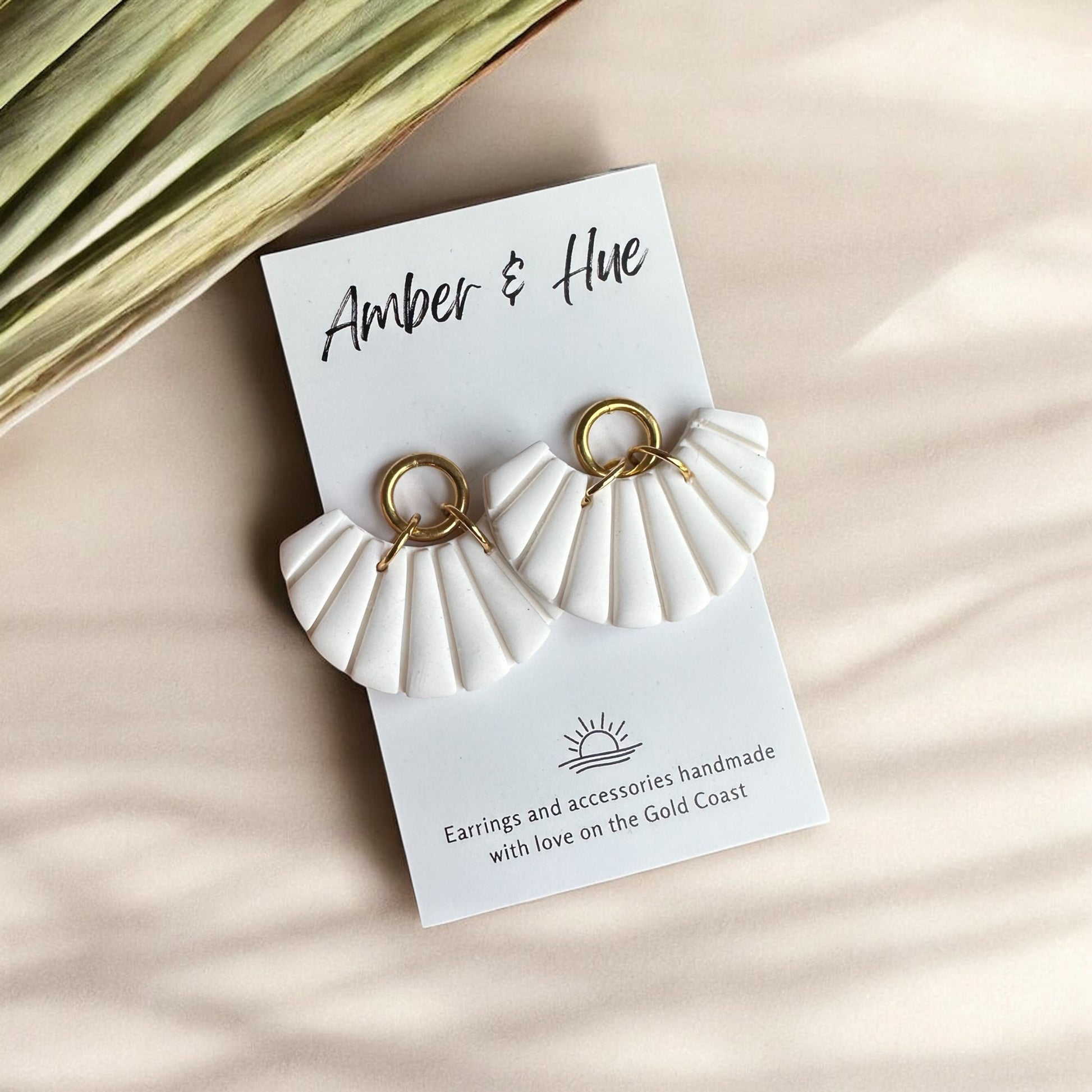Indulge in a touch of handmade elegance with our White Fan and Gold Ring Dangle Earrings. Meticulously crafted from lightweight polymer clay, these exquisite earrings feature a delicate white fan design gracefully suspended from a radiant gold-tone ring.
