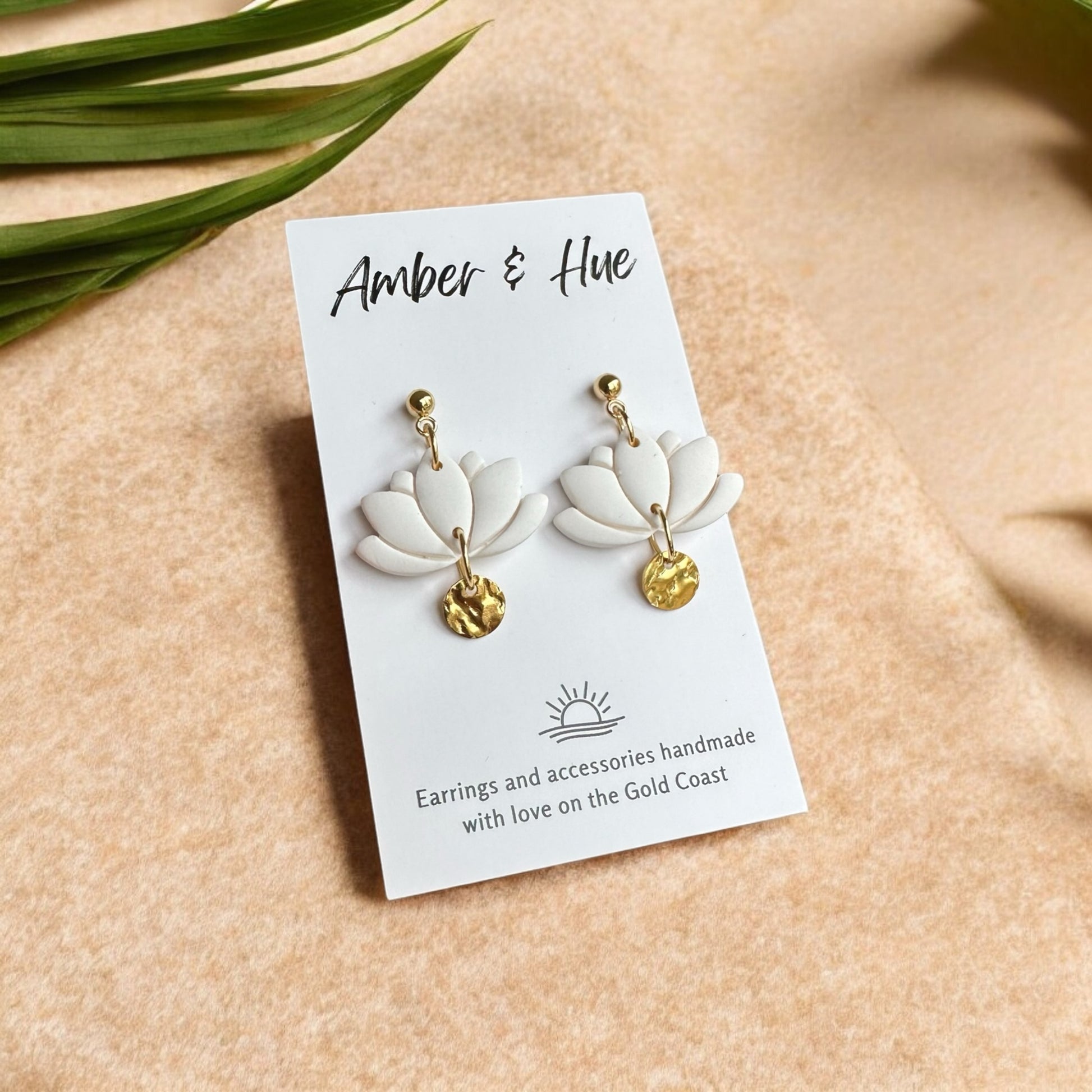 Discover the delicate beauty of our handmade Lotus White and Gold Charm Dangle Earrings, meticulously crafted from lightweight polymer clay. These earrings are more than just accessories; they're a wearable expression of tranquility and refined style.