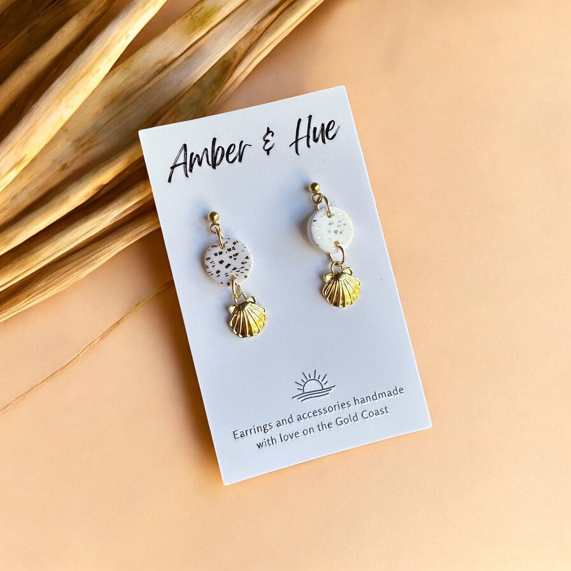Embrace the spirit of the sea with these captivating seashell charm dangle earrings, meticulously handcrafted from polymer clay in elegant white and gold. Each piece is a delicate reminder of the ocean's beauty, adding a touch of coastal charm to your everyday look.
