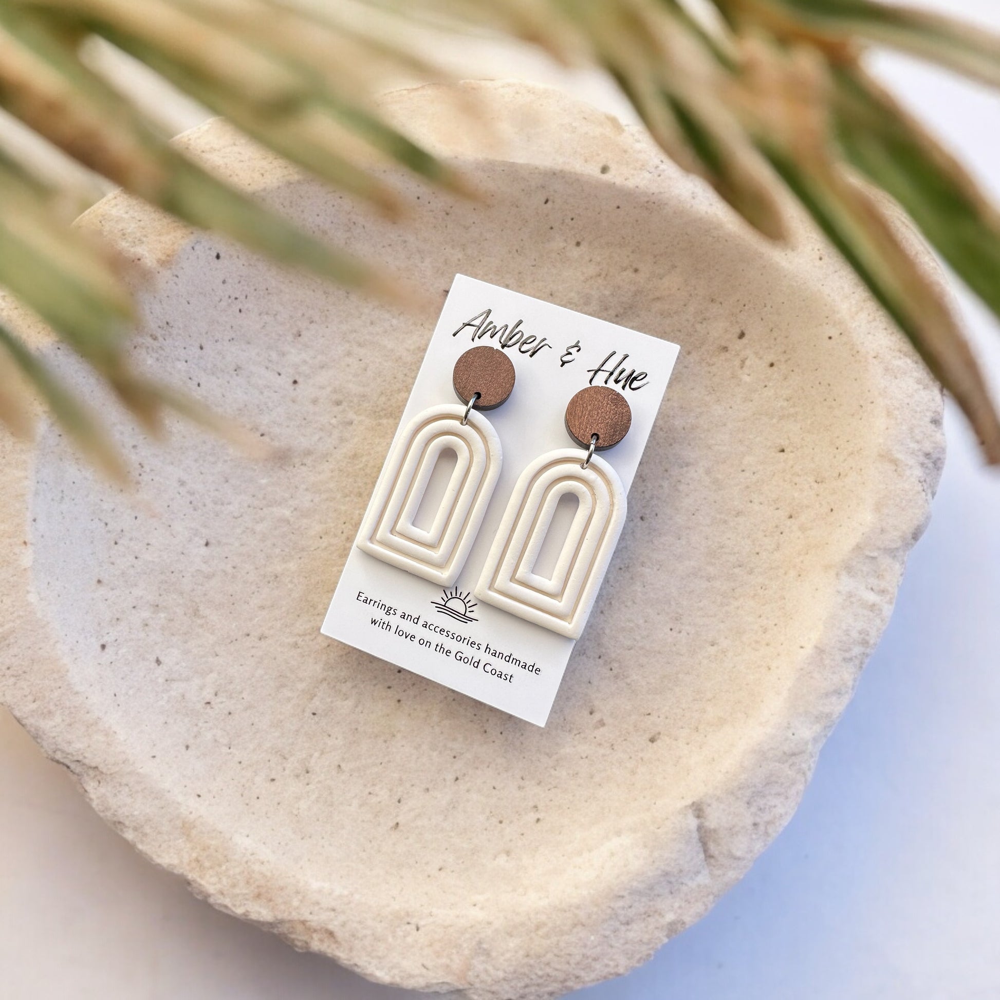 Seek a touch of contemporary elegance with these captivating white arch dangle earrings, handcrafted from lightweight polymer clay and featuring unique wooden stud posts. This unique combination of modern design and natural elements creates a statement piece that's both sophisticated and eye-catching.