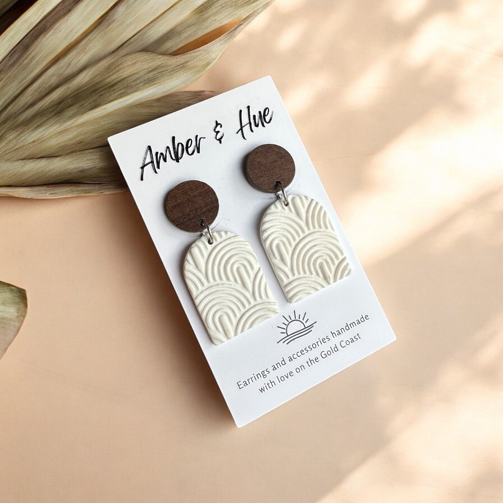Elevate your everyday style with these captivating white arch dangle earrings, handcrafted from textured polymer clay and featuring natural wooden stud posts. This harmonious blend of modern design and nature creates a unique statement piece that adds a touch of texture and personality to any outfit.