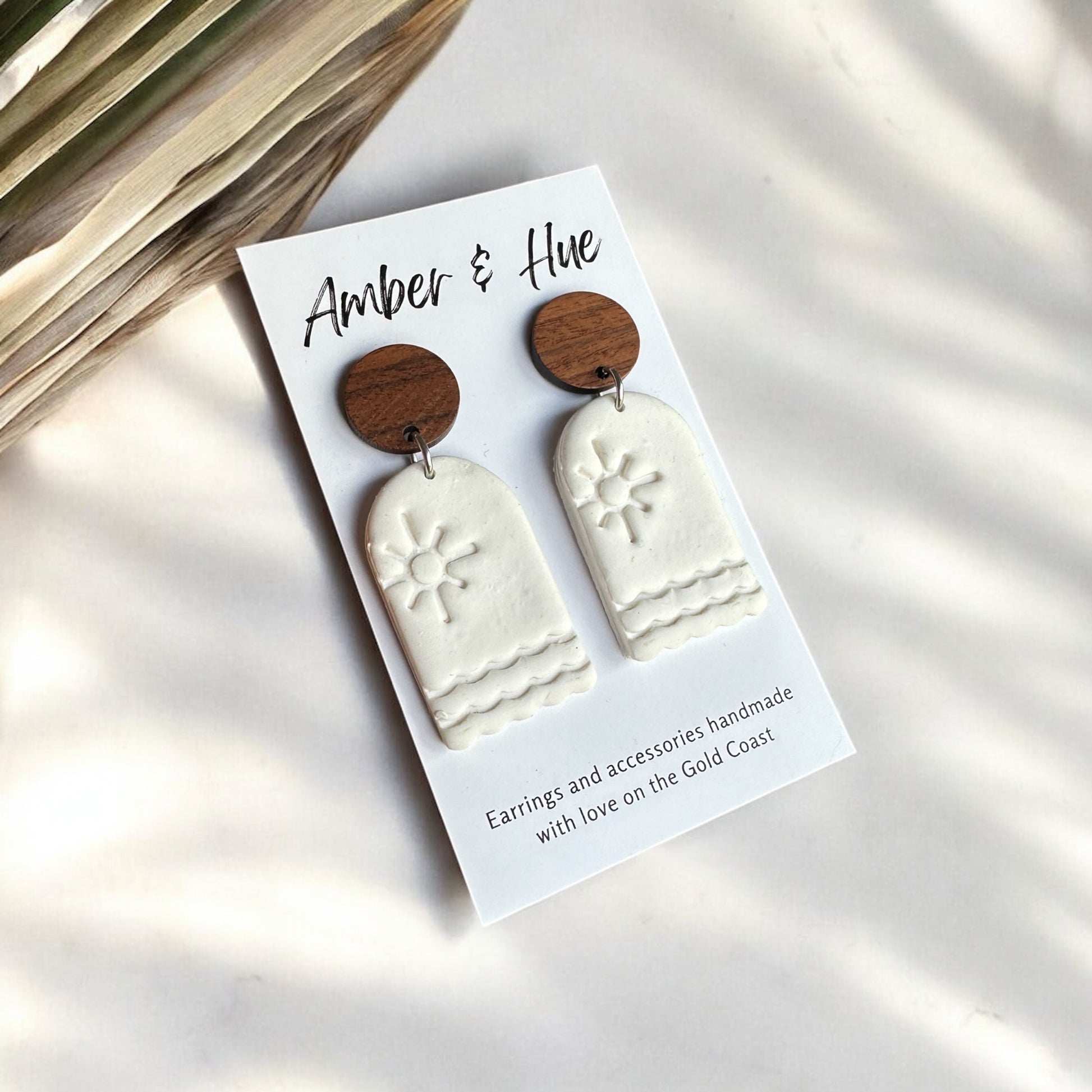 Feel the warmth of the Queensland sun with these captivating white beach pattern earrings, handcrafted from polymer clay and featuring natural wooden stud posts. Each piece is a miniature ode to the Gold Coast's iconic beaches, bringing the spirit of sand, surf, and sun wherever you go.