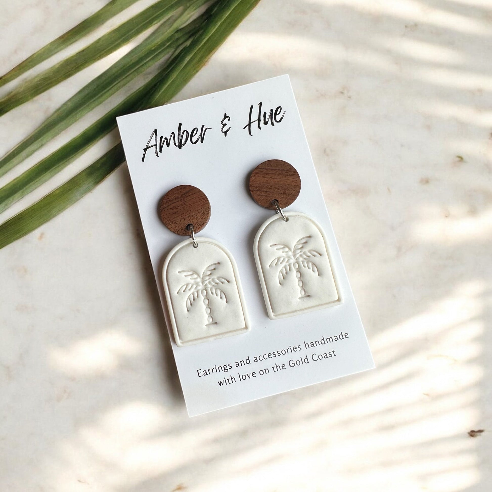 Sway with the Coastline Breeze: White Palm Tree Dangle Earrings, Handmade on the Gold Coast