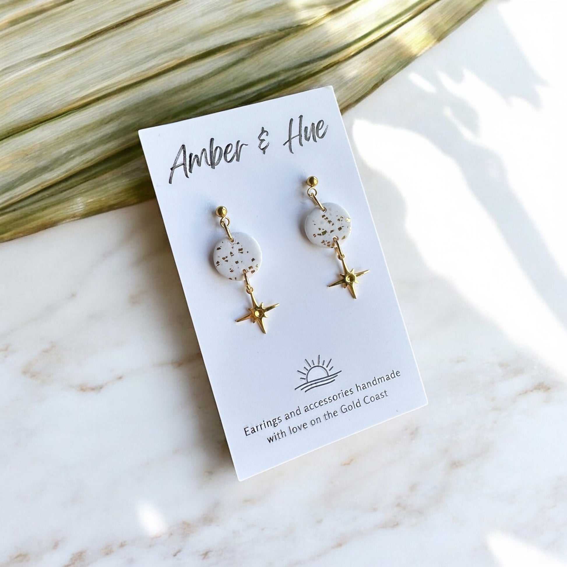 Celestial Elegance: White & Gold Dangle Earrings with a Starry Charm