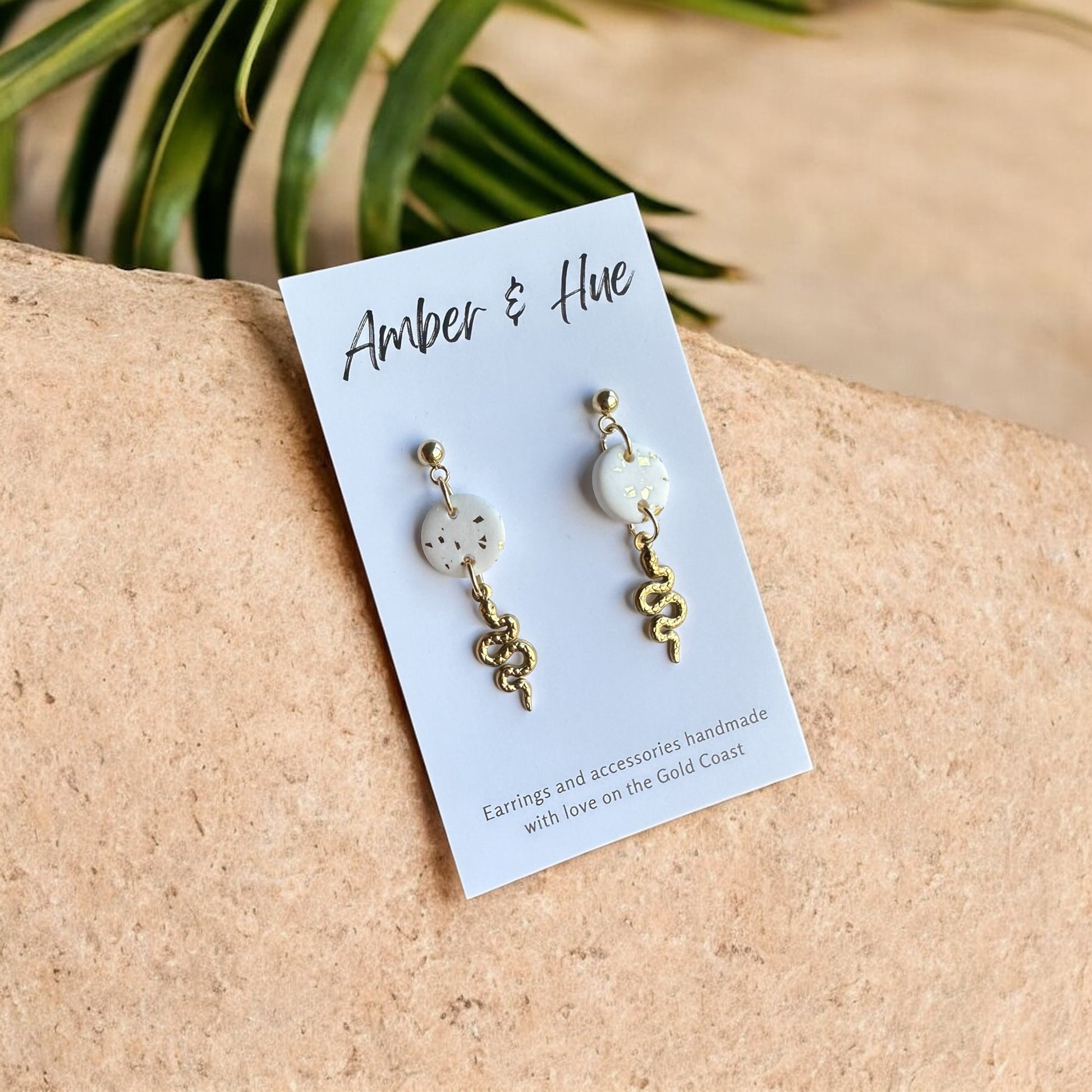 Embrace a touch of sophisticated mystique with these mesmerising White & Gold Snake Dangle Earrings, handcrafted from polymer clay. Each earring features a sinuous snake charm, adorned with shimmering gold details, gracefully dangling from a sleek white base.