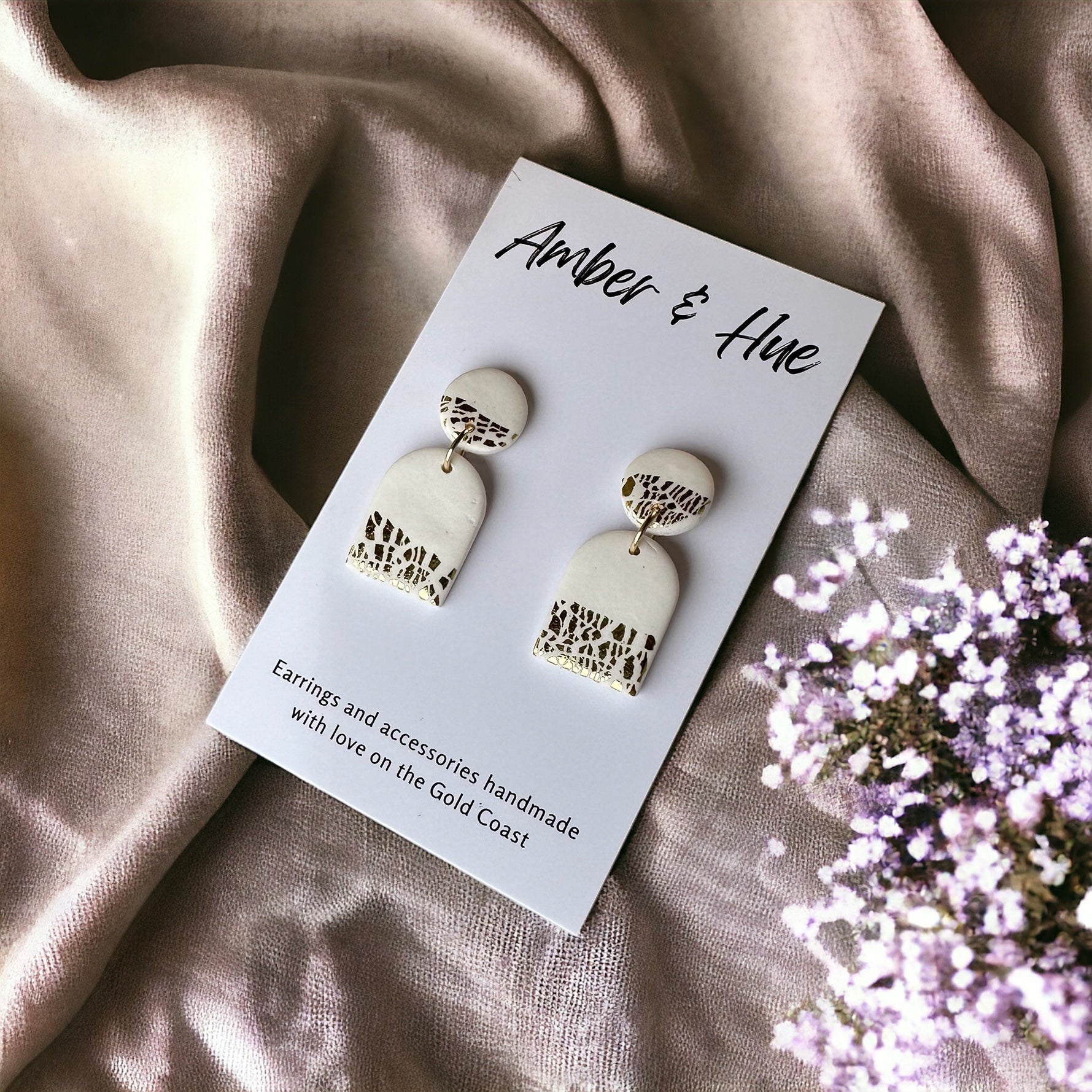 Embrace understated luxury with these handcrafted White & Gold Arch Dangle earrings. Each pair is a unique celebration of clean lines and modern design, adding a touch of sophistication to your everyday look.