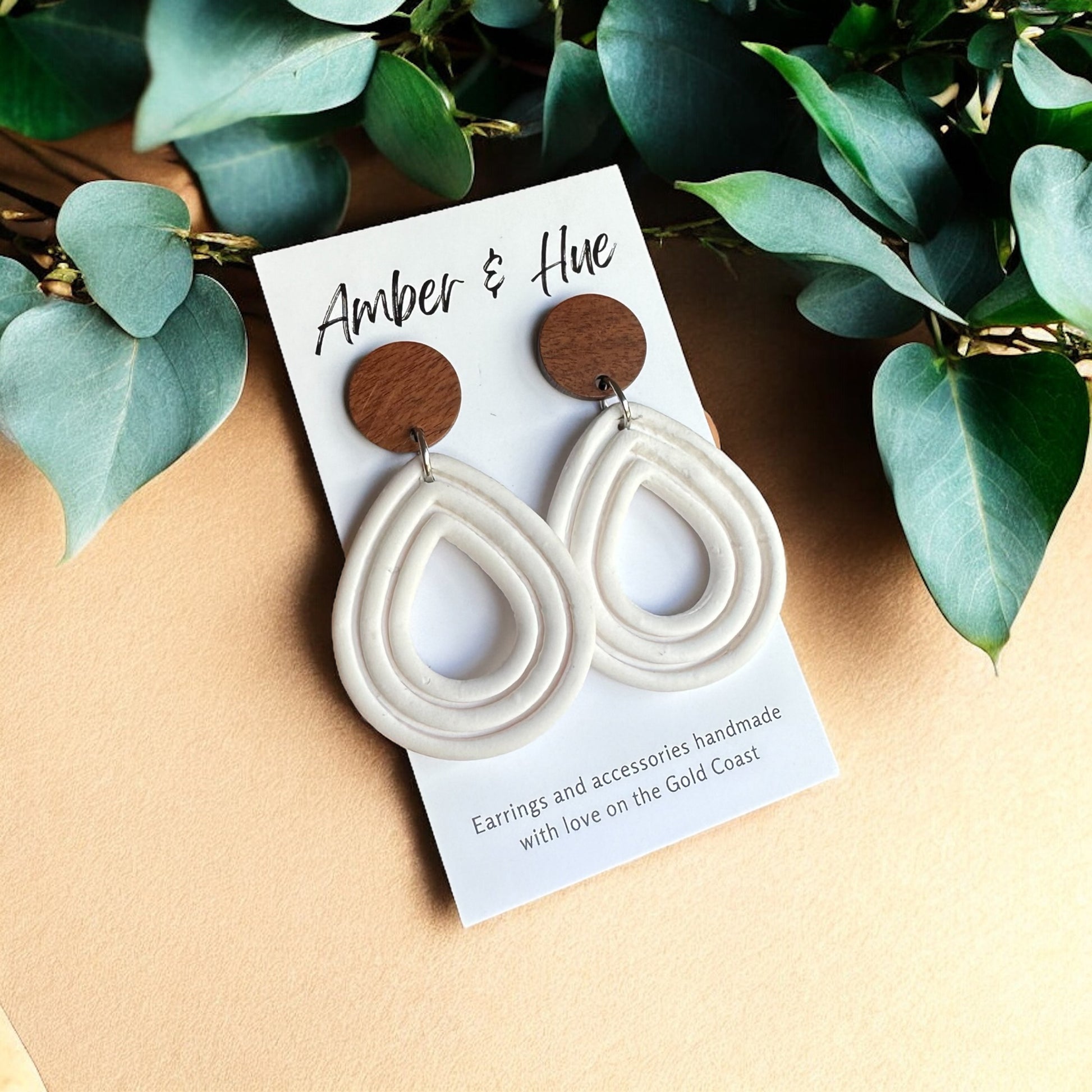 Indulge in classic beauty with these captivating teardrop dangle earrings, handcrafted from lightweight polymer clay and featuring unique wooden stud posts. This elegant combination of timeless design and natural elements creates a versatile statement piece that complements any outfit.