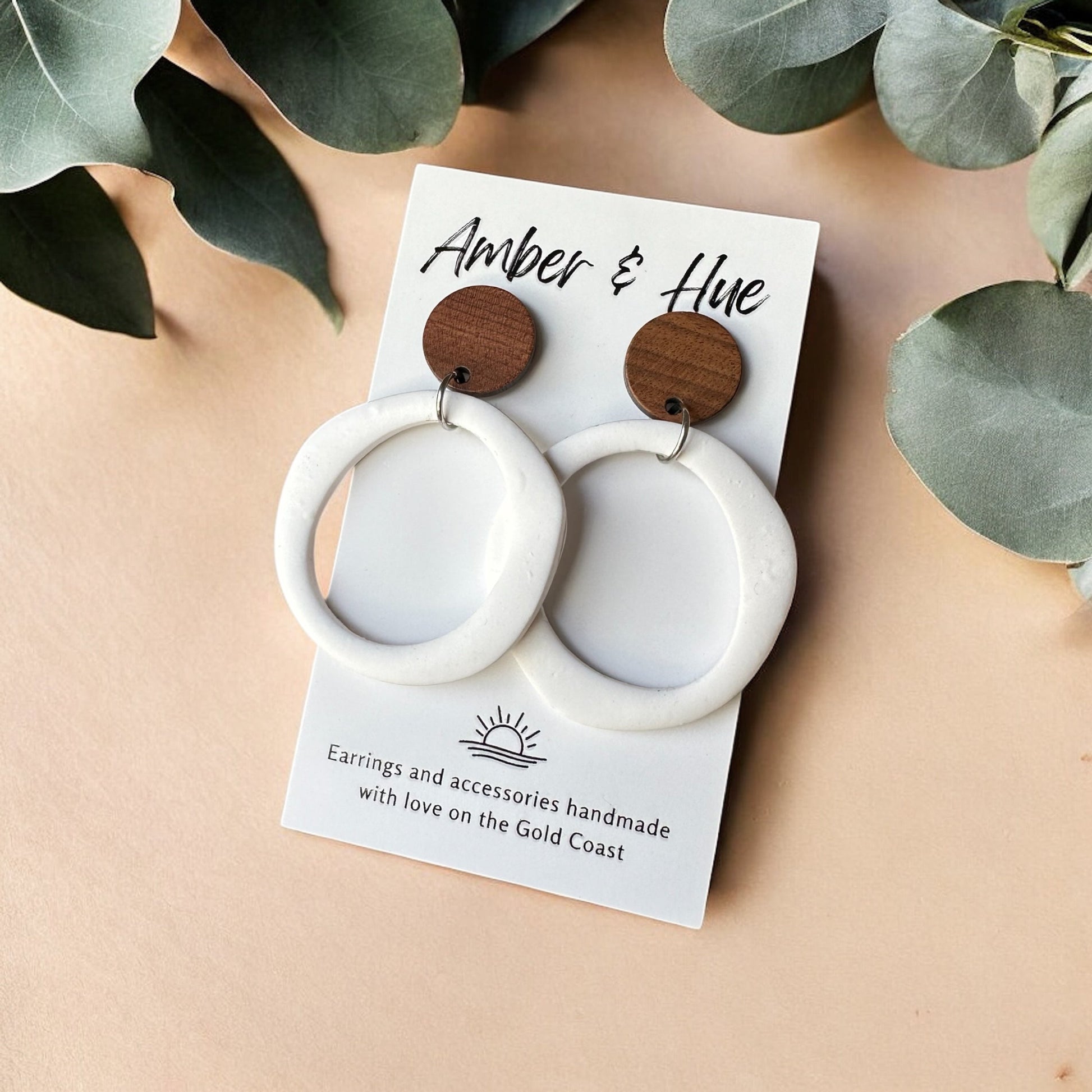 Indulge in contemporary chic with these wide hoop dangle earrings, meticulously handcrafted from pristine white polymer clay and featuring unique wooden stud posts. This modern combination adds a touch of sophisticated simplicity to your everyday look.