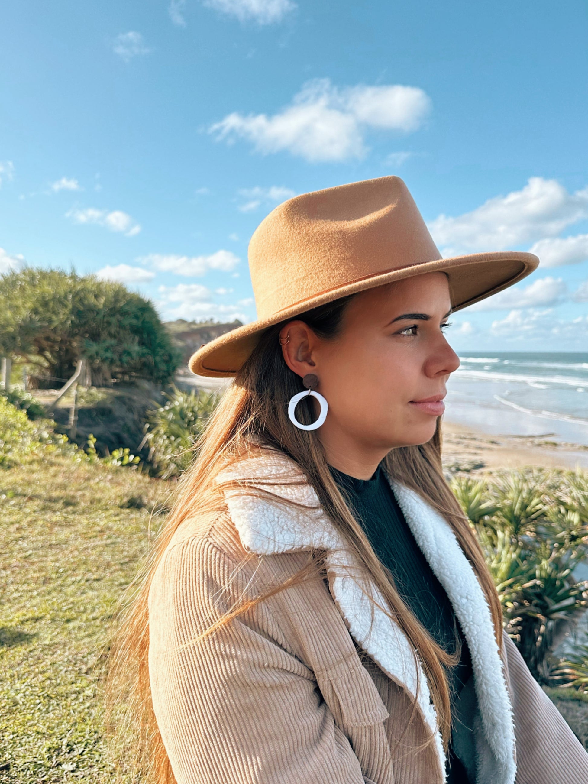 Statement Style: The wide hoop design offers a touch of boldness while the white clay keeps things sophisticated.